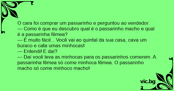 — Daí você leva as minhocas para os passarinhos comerem. A passarinha fêmea só come minhoca fêmea. O passarinho macho só come minhoco macho!