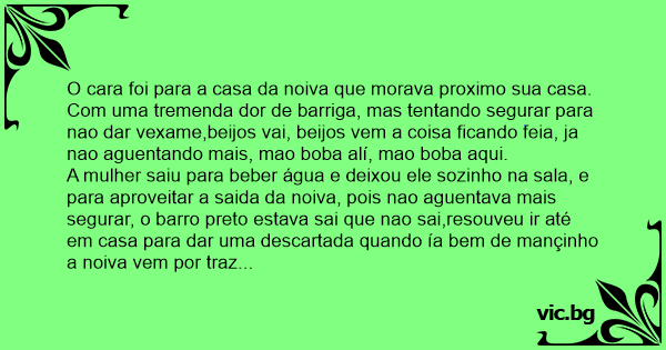 A mulher saiu para beber água e deixou ele sozinho na sala, e para aproveitar a saida da noiva, pois nao aguentava mais segurar, o barro preto estava sai que nao sai,resouveu ir até em casa para dar uma descartada quando ía bem de mançinho a noiva vem por traz dele de surpresa com os dedos na costela dele e aperta, desendo: