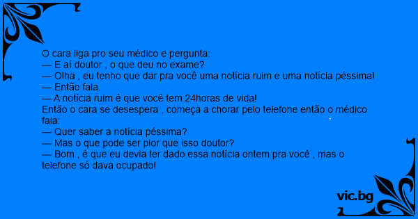 O médico liga para o paciente. — Alfredo, seus exames ficaram prontos. — E aí, doutor? Tudo bem? — Bem nada, rapaz! Tenho duas notícias para te dar: uma ruim e uma péssima. — Diz logo, qual a ruim?...