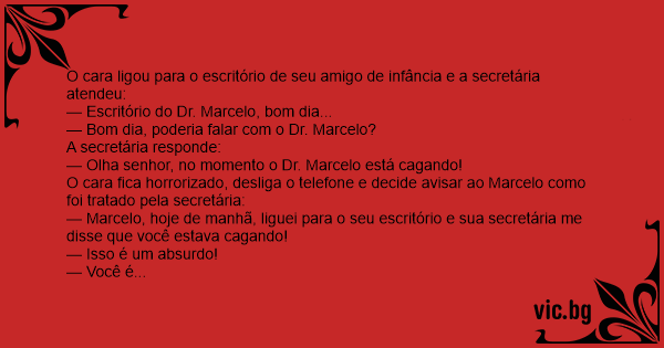 — Marcelo, hoje de manhã, liguei para o seu escritório e sua secretária me disse que você estava cagando!