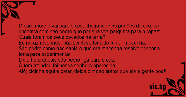 O cara more e vai para o ceu. chegando nos portões do céu, se encontra com são pedro que por sua vez pergunta para o rapaz;