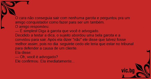 Decidido a testar a dica, o sujeito abordou uma bela garota e a convidou para sair. Após ela dizer "não" ele disse que talvez fosse melhor assim, pois no dia seguinte cedo ele teria que estar no tribunal para defender a causa de um cliente.