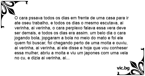 O cara pssava todos os dias em frente de uma casa para ir ate oseu trabalho, e todos os dias o mesmo escutava, ai verinha, ai verinha, o cara perplexo falava essa vera deve ser demais, e todos os dias era assim. um belo dia o cara jogando bola, jopgaram a bola no meio do mato e foi ele quem foi buscar, foi chegando perto de uma moita e ouviu, ai verinha, ai verinha, ai ele disse e hoje que vou conheser essa mulher, abriu a moita e viu um japones com uma vela no cu, e dizia ai verinha, ai verinha.