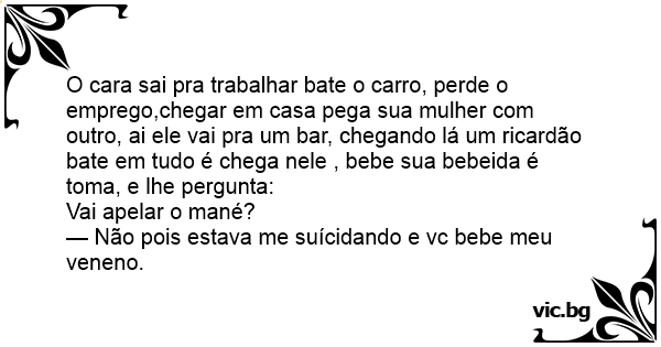 O cara sai pra trabalhar bate o carro, perde o emprego,chegar em casa pega sua mulher com outro, ai ele vai pra um bar, chegando lá um ricardão bate em tudo é chega nele , bebe sua bebeida é toma, e lhe pergunta: