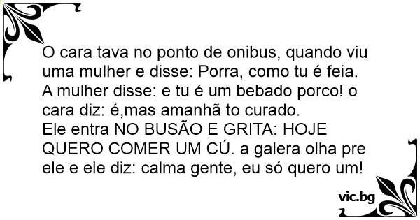 Ele entra NO BUSÃO E GRITA: HOJE QUERO COMER UM CÚ. a galera olha pre ele e ele diz: calma gente, eu só quero um!