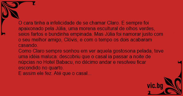 O cara tinha a infelicidade de se chamar Claro. E sempre foi apaixonado pela Júlia, uma morena escultural de olhos verdes, seios fartos e bundinha empinada. Mas Júlia foi namorar justo com o seu melhor amigo, Clóvis, e com o tempo os dois acabaram casando.