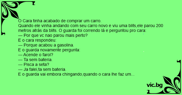 Quando ele vinha andando com seu carro novo e viu uma blits,ele parou 200 metros atrás da blits. O guarda foi correndo lá e perguntou pro cara: