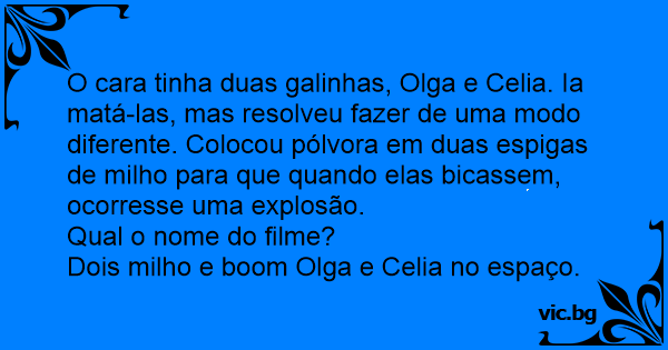 O cara tinha duas galinhas, Olga e Celia. Ia matá-las, mas resolveu fazer de uma modo diferente. Colocou pólvora em duas espigas de milho para que quando elas bicassem, ocorresse uma explosão.