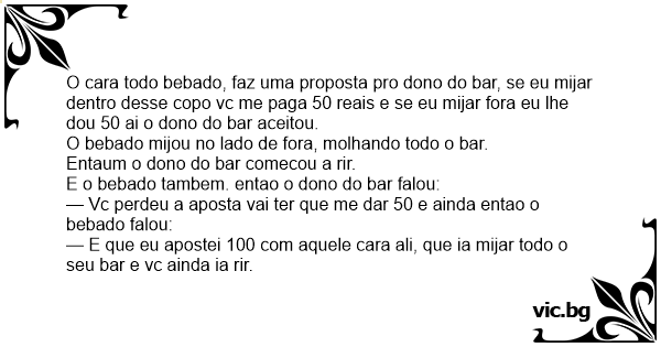 O cara todo bebado, faz uma proposta pro dono do bar, se eu mijar dentro desse copo vc me paga 50 reais e se eu mijar fora eu lhe dou 50 ai o dono do bar aceitou.