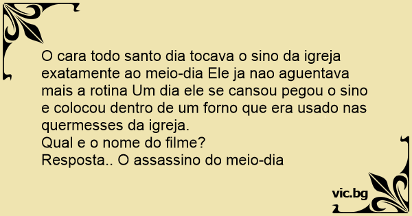 O cara todo santo dia tocava o sino da igreja exatamente ao meio-dia Ele ja nao aguentava mais a rotina Um dia ele se cansou pegou o sino e colocou dentro de um forno que era usado nas quermesses da igreja.