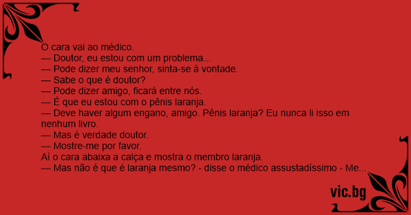 — Mas não é que é laranja mesmo? - disse o médico assustadíssimo - Me diga, você utiliza algum medicamento?