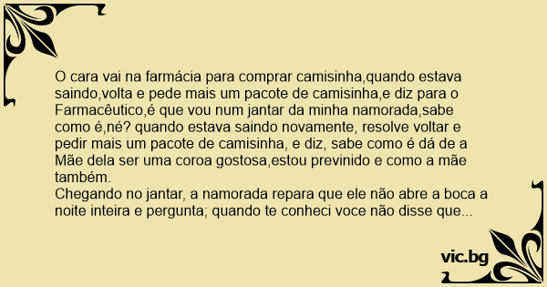 Ο νεαρός πάει στο σπίτι της κοπέλας Φαρμακείο Петнадесетгодишен отива в аптека и иска презерватив. Човек влиза в аптеката и пита: Kommt ein junger Mann zum Apotheker und sagt: 20 годишен мъж влиза в аптека и иска презервативи. Фармацефтът го пита: Un italien est invité à diner chez les parents de sa nouvelle conquête. Едно момче влиза в аптеката и казва на аптекаря: Приходит молодой человек в аптеку и говорит: Va un chaval a una farmacia: #La Boulette un jeune garçon entre dans une pharmacie et demande au pharmacien : - Pouvez-vous me donner un préservatif ? Ma copine m'a invité à dîner ce soir et je crois qu'elle attend quelque chose de moi." Le pharmacien lui donne le préservatif et quand il va sortir, le garçon se retourne et... Alfredo había sido invitado por primera vez a cenar con la familia de su novia, así que pensando en si la chica "caía" luego de cinco largos meses, pasó por una farmacia para comprar un preservativo. Le dice al farmacéutico: - Oiga, déme un preservativo que esta noche ceno con la familia de mi... Une fille demande à son petit ami de venir dîner chez ses parents le vendredi soir. Comme c'est un grand événement, elle lui annonce qu'après le repas, ils sortiront en boite et puis ensuite, elle se donnera à lui pour la première fois. Le garçon est hyper excité par cette idée (ah la... En ung kille kommer in på apoteket för att köpa en kondom. Det är första gången han köper något sådant och han känner att han vill berätta varför för apotekaren. "Jag skall hem till min flickvän på middag och träffa hennes familj för första gången ikväll och jag är nästan säker på att jag sedan... W aptece stoi nieśmiały chłopak. Gdy wszyscy klienci wyszli, aptekarz pyta: - Co, pierwsza randka? - Gorzej - odpowiada chłopak - pierwsza gościna u mojej dziewczyny. - Rozumiem - mówi aptekarz - masz tu prezerwatywę. Chłopak się rozochocił. -... A young man goes into a drug store to buy condoms. The pharmacist says the condoms come in packs of 3, 9 or 12 and asks which the young man wants. "Well," he said, "I've been seeing this girl for... Ein Sechzehnjähriger kommt in eine Apotheke und sagt schüchtern, dass er sich am Abend mit einem hübschen Mädchen träfe und nun etwas benötige. Der Apotheker nickt verständnisvoll: "Brauchst´ ein... Een meisje vraagt haar vriendje om vrijdagavond bij haar ouders te komen eten. Omdat dit een hele stap is, kondigt het meisje aan dat ze daarna met hem uit wil gaan en dan voor het eerst met hem... Een jongen gaat bij zijn vriendin op bezoek om haar ouders te ontmoeten. De vriendin heeft echter andere plannen met hem. Ze wil met hem vrijen nadat de ouders gaan vertrekken naar hun... Va un niño a la farmacia y dice: - Déjeme un condón, que hoy voy a casa de mi novia y seguro que cae, bueno déjeme otro más porque tiene una madre que está bien buena y seguro que también cae.... En ung man kommer in på ett apotek. Nervöst slänger han fram en kondom på disken. Han känner att ha vill förklara sitt köp och säger: - Jag ska äta middag med min flickvän och hennes familj idag... En ung pojke går ett apotek och apotekaren säger: - Hej, kan du ge mig en kondom. Min flickvän bjöd mig på middag ikväll och jag tror att hon förväntar sig något från mig. Farmaceuten ger honom... Um cara entra numa farmácia pra comprar camisinhas. O farmacêutico diz que tem embalagens de 3,9 e 12 e pergunta qual ele quer. Bom, eu to saindo com essa garota tem um tempão e ela e muito quente.... Poika marssi apteekkiin. Apteekkari: "Mitä saisi olla ?" Poika: "No tulinpahan vaan ostamaan noita varmuusvälineitä." Apteekkari: "Ja kuinkahan paljon ?" Poika: "No anna nyt saman tien vaikka... Un giovane ragazzo entra in una farmacia e dice al farmacista: - Buon giorno, mi dia un preservativo. La mia ragazza mi ha invitato a cena stasera e credo che si aspetta qualcosa da me. Il... Ayşe ali’yi arayıp “ali bu akşam bize gel seni çok arzuluyorum. önce annem ve babamla sofraya oturur yemek yeriz, sonra da benim odama geçip ders çalışıyormuş gibi yapıp sevişiriz.” demiş. doğru... Egyszer, amikor már egy fiú és egy lány régóta jártak, a lány egyszer csak megszólallt egy kellemes délutánt követően: - Ha holnap eljössz hozzánk vacsorára, akkor oda adom neked a szüzességem még... Gigel se pregateste cu nerabdare pentru prima lui intilnire cu Ileana: fata l-a tot batut la cap ca parintii ei nu vor fi acasa in seara respectiva. Ocazia mult asteptata fiind foarte aproape,... Um garoto de 15 anos entra na farmácia. — Quero uma camisinha. — Para que vc quer uma camisinha nessa idade? — É que vou jantar na casa da minha namorada hoje e, sabe como é, né, pode rolar alguma... Um jovem chega à Farmácia e pede ao atendente um preservativo: — Sabe o que é, hoje vou jantar na casa da minha namorada, quem sabe ela dá em cima de mim... Eu já estarei previnido... Dez minutos... Un jour, un adolescent de 16 ans rentre dans une phamarcie et demande : - Un préservatif s'il vous plait, je vais chez ma copine ce soir et je sais qu'elle attend quelque chose de moi. Le... Bula merge la farmacie: - Dati-mi si mie un prezervativ ca merg la prietena mea Si o comit in seara asta ca e buna rau... De fapt Dati-mi doua ca are o mama... yoo... Si pe aia o ard... Ba nu... Genc kiz genc asigina telefon acmis : - Jean, demis, seni cok arzuluyorum, geceleri uyku uyuyamiyorum. Ne olur bu hafta sonu bize yemege gel. Seni annem babamla Tanistirayim. Sonra benim odamda... Manden og apotekeren En ung fyr kommer ind på apoteket og går hen til disken. Apotekeren spørger: Og hvad kan jeg så hjælpe med? Fyren svarer: Jeg vil gerne bede om en pakke kondomer 
