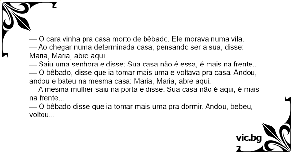 — O bêbado, disse que ia tomar mais uma e voltava pra casa. Andou, andou e bateu na mesma casa: Maria, Maria, abre aqui.