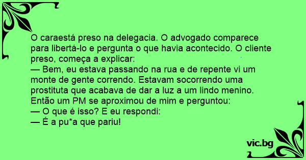 — Bem, eu estava passando na rua e de repente vi um monte de gente correndo. Estavam socorrendo uma prostituta que acabava de dar a luz a um lindo menino. Então um PM se aproximou de mim e perguntou: