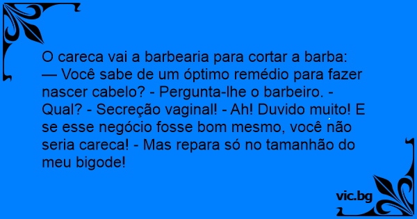 — Você sabe de um óptimo remédio para fazer nascer cabelo? - Pergunta-lhe o barbeiro. - Qual? - Secreção vaginal! - Ah! Duvido muito! E se esse negócio fosse bom mesmo, você não seria careca! - Mas repara só no tamanhão do meu bigode!