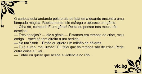— Três desejos? — diz o gênio — Estamos em tempos de crise, meu amigo... Você só tem direito a um pedido!