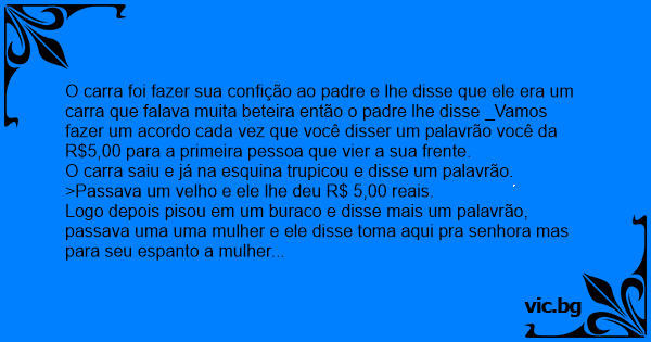 O carra foi fazer sua confição ao padre e lhe disse que ele era um carra que falava muita beteira então o padre lhe disse _Vamos fazer um acordo cada vez que você disser um palavrão você da R$5,00 para a primeira pessoa que vier a sua frente.