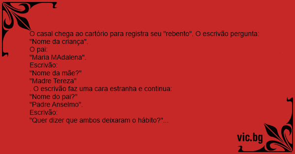 O casal chega ao cartório para registra seu "rebento". O escrivão pergunta:
