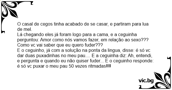 E o ceguinho, já com a solução na ponta da lingua, disse: é só vc dar duas puxadinhas no meu раu.... E a ceguinha diz: Ah, entendi, e pergunta e quando eu não quiser fuder... E o ceguinho responde: é só vc puxar o meu раu 50 vezes ritmadas!!!!
