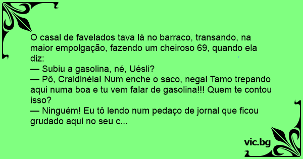— Pô, Craldinéia! Num enche o saco, nega! Tamo trepando aqui numa boa e tu vem falar de gasolina!!! Quem te contou isso?