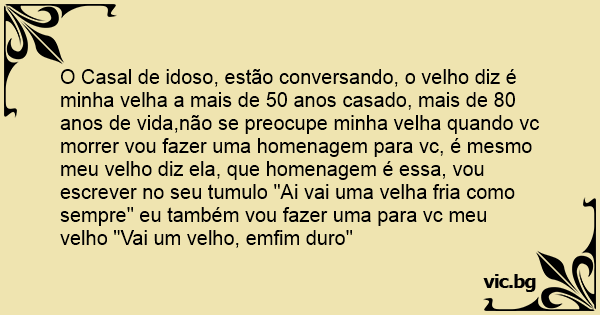 O Casal de idoso, estão conversando, o velho diz é minha velha a mais de 50 anos casado, mais de 80 anos de vida,não se preocupe minha velha quando vc morrer vou fazer uma homenagem para vc, é mesmo meu velho diz ela, que homenagem é essa, vou escrever no seu tumulo "Ai vai uma velha fria como sempre" eu também vou fazer uma para vc meu velho "Vai um velho, emfim durо"