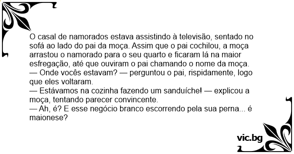 O casal de namorados estava assistindo à televisão, sentado no sofá ao lado do pai da moça. Assim que o pai cochilou, a moça arrastou o namorado para o seu quarto e ficaram lá na maior esfregação, até que ouviram o pai chamando o nome da moça.