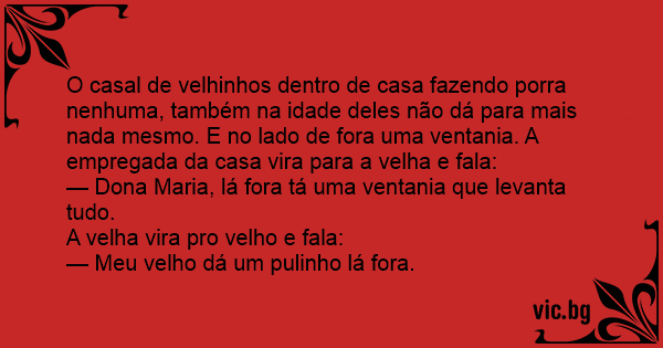 O casal de velhinhos dentro de casa fazendo роrrа nenhuma, também na idade deles não dá para mais nada mesmo. E no lado de fora uma ventania. A empregada da casa vira para a velha e fala: