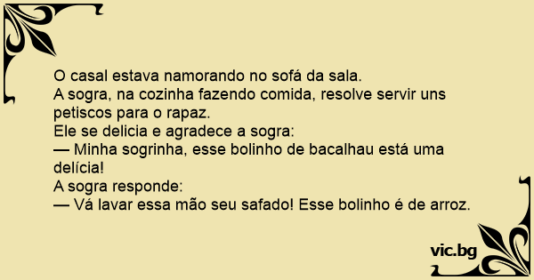 — Minha sogrinha, esse bolinho de bacalhau está uma delícia!