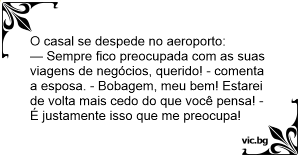 — Sempre fico preocupada com as suas viagens de negócios, querido! - comenta a esposa. - Bobagem, meu bem! Estarei de volta mais cedo do que você pensa! - É justamente isso que me preocupa!