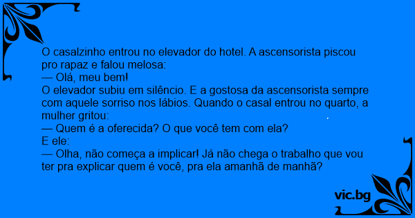 O casalzinho entrou no elevador do hotel. A ascensorista piscou pro rapaz e falou melosa: