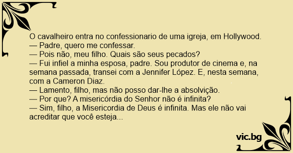 — Fui infiel a minha esposa, padre. Sou produtor de cinema e, na semana passada, transei com a Jennifer López. E, nesta semana, com a Cameron Diaz.