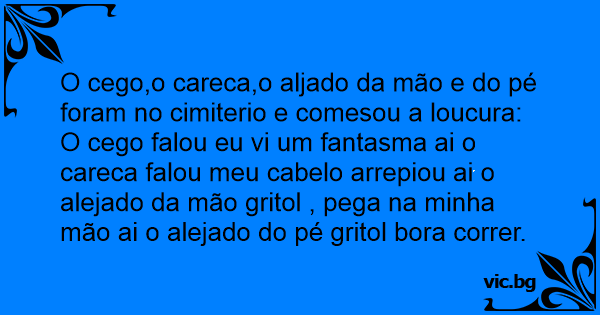 O cego,o careca,o aljado da mão e do pé foram no cimiterio e comesou a loucura: O cego falou eu vi um fantasma ai o careca falou meu cabelo arrepiou ai o alejado da mão gritol , pega na minha mão ai o alejado do pé gritol bora correr.
