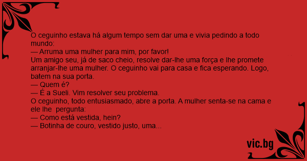 Um amigo seu, já de saco cheio, resolve dar-lhe uma força e lhe promete arranjar-lhe uma mulher. O ceguinho vai para casa e fiса esperando. Logo, batem na sua porta.