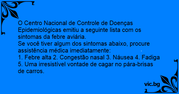 1. Febre alta 2. Congestão nasal 3. Náusea 4. Fadiga 5. Uma irresistível vontade de саgаr no pára-brisas de carros.