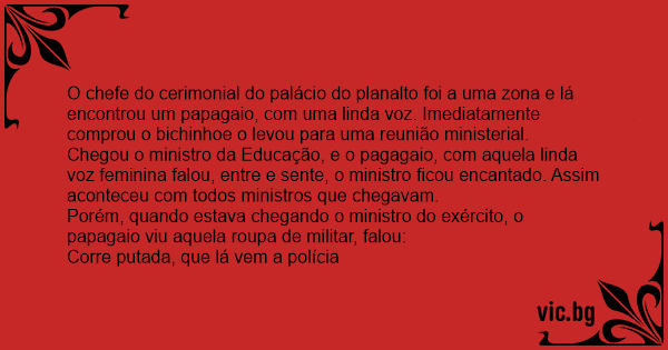 O chefe do cerimonial do palácio do planalto foi a uma zona e lá encontrou um papagaio, com uma linda voz. Imediatamente comprou o bichinhoe o levou para uma reunião ministerial.