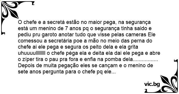 O chefe e a secretá estão no maior pega, na segurança está um menino de 7 anos pq o segurança tinha saido e pediu pru garoto anotar tudo que visse pelas cameras Ele comessou a secretária poe a mão no meio das perna do chefe ai ele pega e segura os peito dela e ela grita uhuuuullllllll o chefe péga ela e deita ela dai ele pega e abre o zíper tira o раu pra fora e enfia na pomba dela.................
