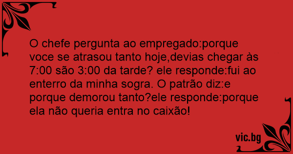 O chefe pergunta ao empregado:porque voce se atrasou tanto hoje,devias chegar às 7:00 são 3:00 da tarde? ele responde:fui ao enterro da minha sogra. O patrão diz:e porque demorou tanto?ele responde:porque ela não queria entra no caixão!
