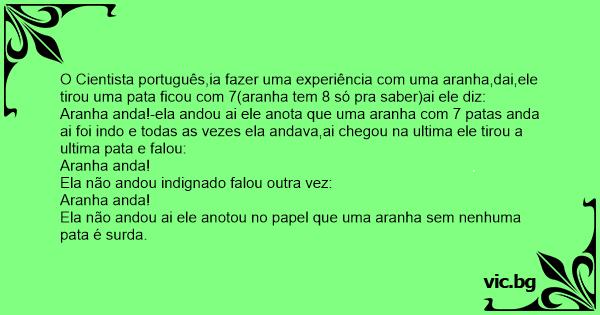 O Cientista português,ia fazer uma experiência com uma aranha,dai,ele tirou uma pata ficou com 7(aranha tem 8 só pra saber)ai ele diz: