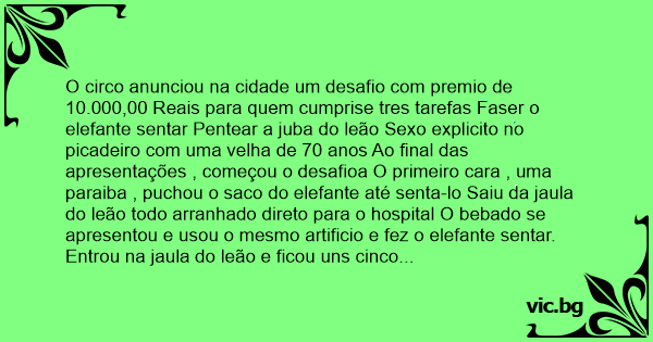 O circo anunciou na cidade um desafio com premio de 10.000,00 Reais para quem cumprise tres tarefas Faser o elefante sentar Pentear a juba do leão Sеxо explicito no picadeiro com uma velha de 70 anos Ao final das apresentações , começou o desafioa O primeiro cara , uma paraiba , puchou o saco do elefante até senta-lo Saiu da jaula do leão todo arranhado direto para o hospital O bebado se apresentou e usou o mesmo artificio e fez o elefante sentar.