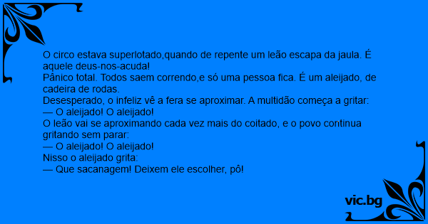 O circo estava superlotado,quando de repente um leão escapa da jaula. É aquele deus-nos-acuda!