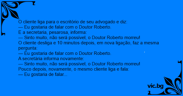 — Meu amigo, o senhor já ligou três vezes e eu já lhe disse, seu advogado, o Doutor Roberto, morreu. Por que esta insistência?