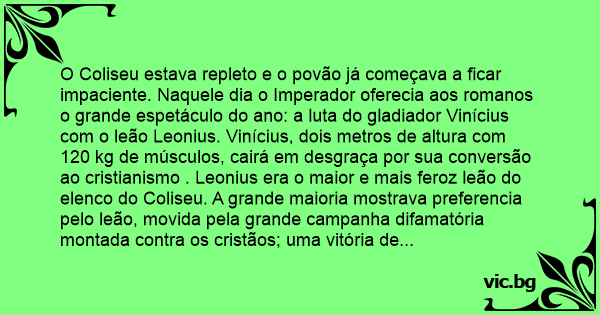 O Coliseu estava repleto e o povão já começava a ficar impaciente. Naquele dia o Imperador oferecia aos romanos o grande espetáculo do ano: a luta do gladiador Vinícius com o leão Leonius. Vinícius, dois metros de altura com 120 kg de músculos, cairá em desgraça por sua conversão ao cristianismo . Leonius era o maior e mais feroz leão do elenco do Coliseu. A grande maioria mostrava preferencia pelo leão, movida pela grande campanha difamatória montada contra os cristãos; uma vitória de Vinícius porem não causaria muita surpresa, hábil como era no manejo das armas. Chegou o grande momento: Vinícius entrou na arena vestindo somente uma tanga, sem portar qualquer arma. A multidão suspirou aliviada. A surpresa foi ainda maior quando os soldados abriram um grande buraco no centro da arena e nele enterraram Vinícius em pé, deixando apenas sua cabeça do lado de fora. A multidão chegou ao delírio e o Imperador, raposa velha, sorria de satisfação ao constatar a receptividade de sua estratégia. A arena foi esvaziada, que ninguém era de ferro, e entrou Leonius. NOlhou imponente para a multidão que o ovacionava e começou a caminhar lentamente para Vinícius, ou melhor, para sua cabeça. Ao chegar a uma distância de uns dez metros, iniciou a corrida e deu um grande salto, com a óbvia intenção de abocanhar seu prato. Vinícius moveu rapidamente sua cabeça para o lado, conseguindo iludir o leão e escapar de seus afiados dentes. A multidão esbravejava e incentivava a fera, gritando em coro: mata, mata, mata... Leonius deu a volta na arena, tomou mais distância e partiu para o segundo bote com mais velocidade. Desta vez Vinícius desviou a cabeça para trás e, quando o leão passou por cima dela, abocanhou seus testículos, segurando-os entre os dentes com todas as suas forças. Sem aliviar a pressão, foi inclinando a cabeça para o lado de modo a obrigar o leão a se deitar. A multidão calou-se estupefata. O enorme leão ia caindo lentamente ao lado da cabeça de Vinícius quando o Imperador, perdendo a compostura, levantou-se e gritou: