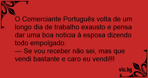 O Comerciante Português volta de um longo dia de trabalho exausto e pensa dar uma boa noticia à esposa dizendo todo empolgado: