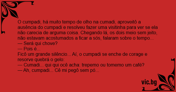 O cumpadi, há muito tempo de olho na cumadi, aproveitô a ausência do cumpadi e resolveu fazer uma visitinha para ver se ela não carecia de arguma coisa. Chegando lá, os dois meio sem jeito, não estavam acostumados a ficar a sós, falaram sobre o tempo...