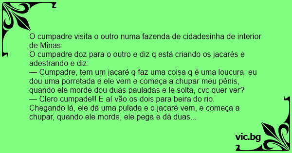 — Cumpadre, tem um jacaré q faz uma coisa q é uma loucura, eu dou uma porretada e ele vem e começa a сhuраr meu pênis, quando ele morde dou duas pauladas e le solta, cvc quer ver?