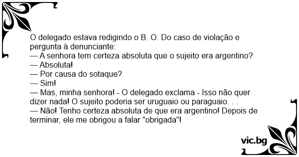 — Mas, minha senhora! - O delegado exclama - Isso não quer dizer nada! O sujeito poderia ser uruguaio ou paraguaio. . .