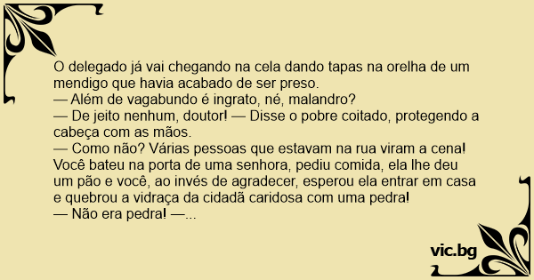 — Como não? Várias pessoas que estavam na rua viram a cena! Você bateu na porta de uma senhora, pediu comida, ela lhe deu um pão e você, ao invés de agradecer, esperou ela entrar em casa e quebrou a vidraça da cidadã caridosa com uma pedra!