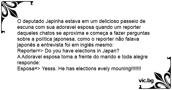 O deputado Japinha estava em um delicioso passeio de escuna com sua adoravel esposa quando um reporter daqueles chatos se aproxima e começa a fazer perguntas sobre a política japonesa, como o reporter não falava japonês a entrevista foi em inglês mesmo: