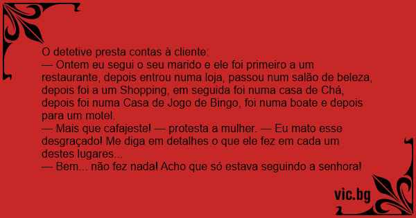 — Ontem eu segui o seu marido e ele foi primeiro a um restaurante, depois entrou numa loja, passou num salão de beleza, depois foi a um Shopping, em seguida foi numa casa de Chá, depois foi numa Casa de Jogo de Bingo, foi numa boate e depois para um motel.