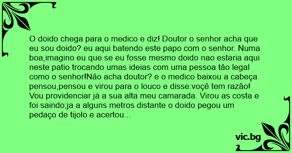 O doido chega para o medico e diz! Doutor o senhor acha que eu sou doido? eu aqui batendo este papo com o senhor. Numa boa,imagino eu que se eu fosse mesmo doido nao estaria aqui neste patio trocando umas ideias com uma pessoa tâo legal como o senhor!Nâo acha doutor? e o medico baixou a cabeça pensou,pensou e virou para o louco e disse:voçê tem razão!Vou providenciar já a sua alta meu camarada. Virou as costa e foi saindo;ja a alguns metros distante o doido pegou um pedaço de tijolo e acertou as costas do medico e disse:não esqueça nao ta doutor!